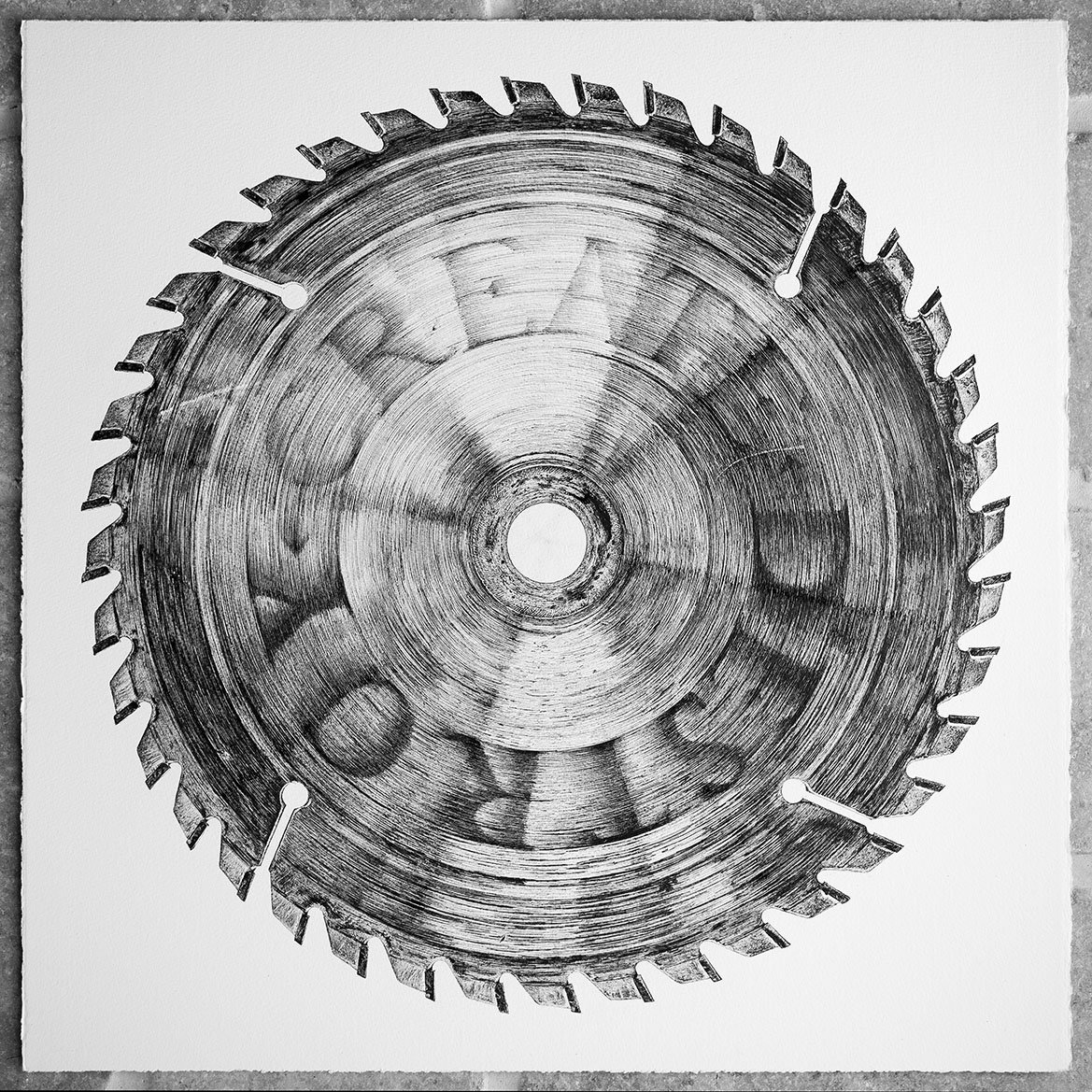 Limited edition wall art print from an original illustration by CJP. A wood saw blade here acts as a visual metaphor for the human desire to rework the world we live in and the cycle of destruction leading to creation and renaissance, which in turn leads again to destruction etc. But, ultimately, it hints at our own mortality as the blade is blunted and the wheel eventually stops spinning.