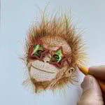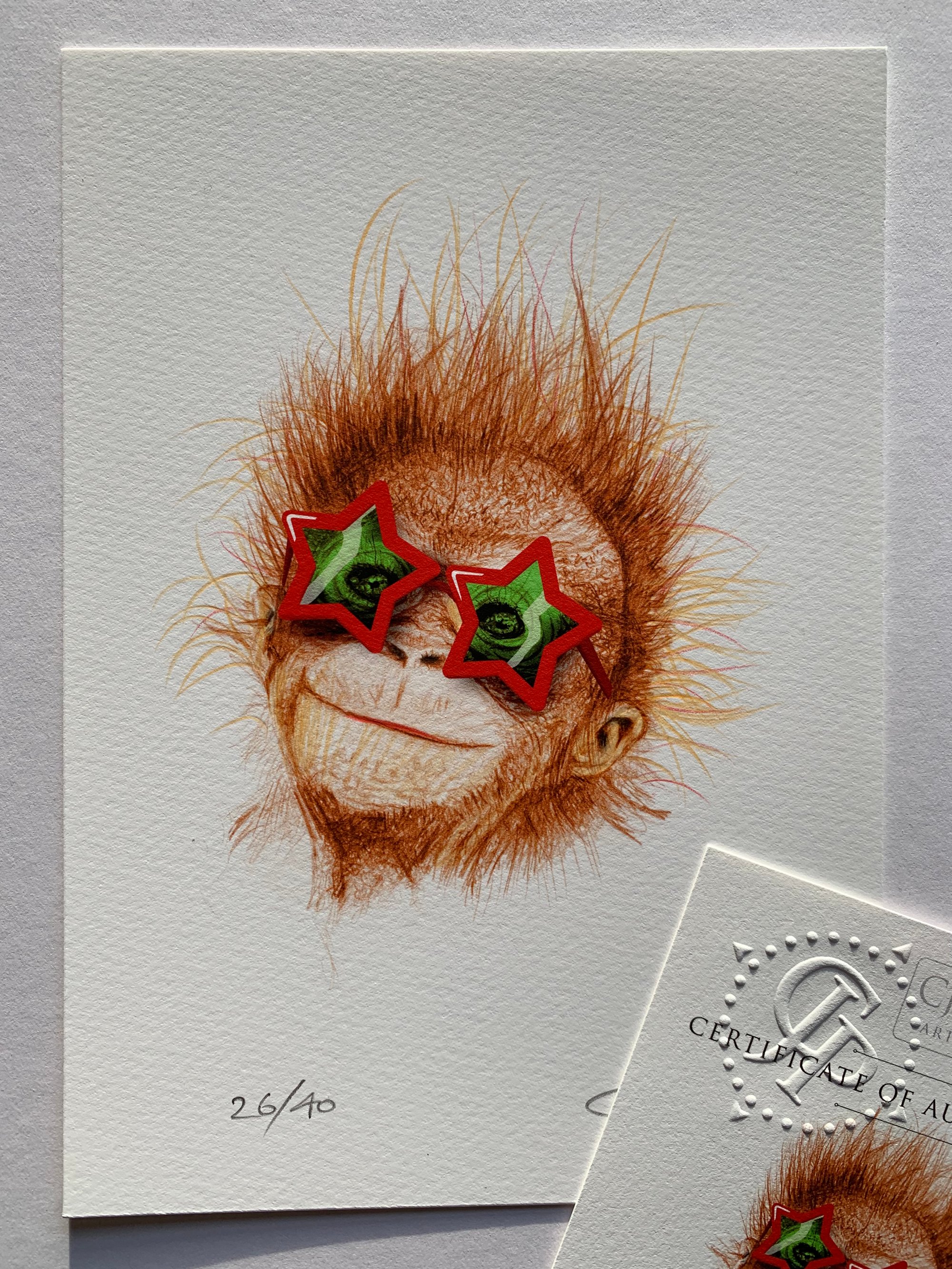 Hand finished giclée print of a baby orangutan looking cool in star-shaped sunglasses.