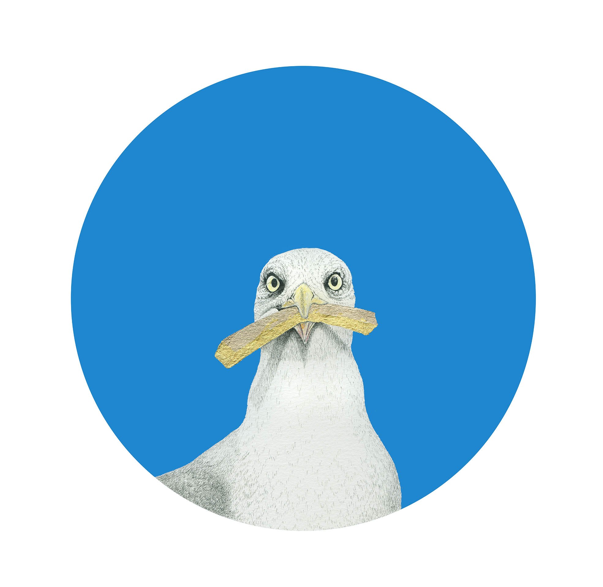 Cheeky seaside seagull with a freshly nabbed chip, hand finished with 24k and 22k gold leaf.