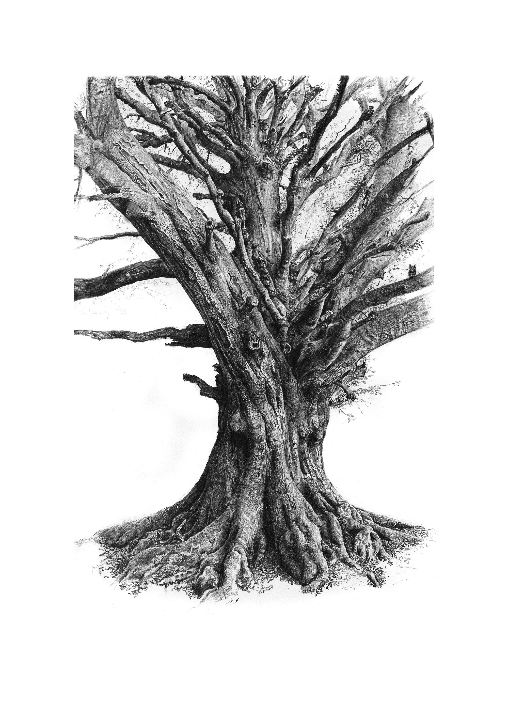 Pencil drawing of 'King of the Forest', an ancient English beech tree.
